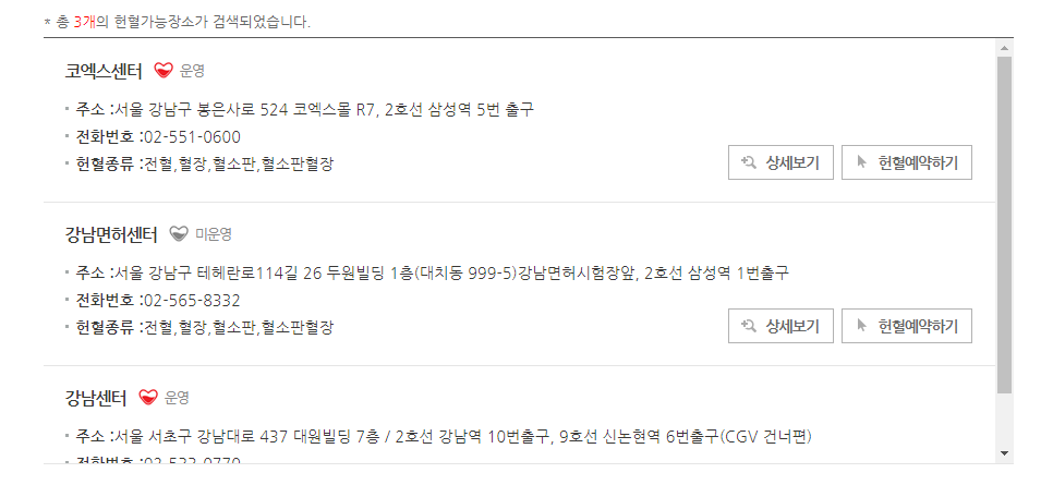 헌혈의집 이용시간을 확인해보려고 한번 검색을 해봤어요. 강남이라고 검색하니까 헌혈의집 코엑스센터, 강남면허센터, 강남센터가 나오네요.