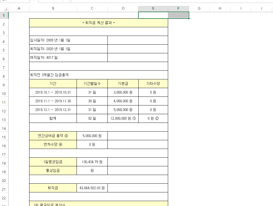 엑셀로 퇴직금 계산 내역을 확인하 실 수 있습니다.