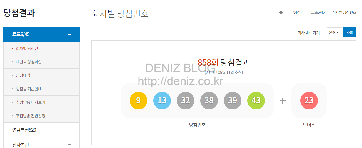 858회 로또 당첨번호는 9, 13, 32, 38, 39, 43 (보너스 23)입니다.