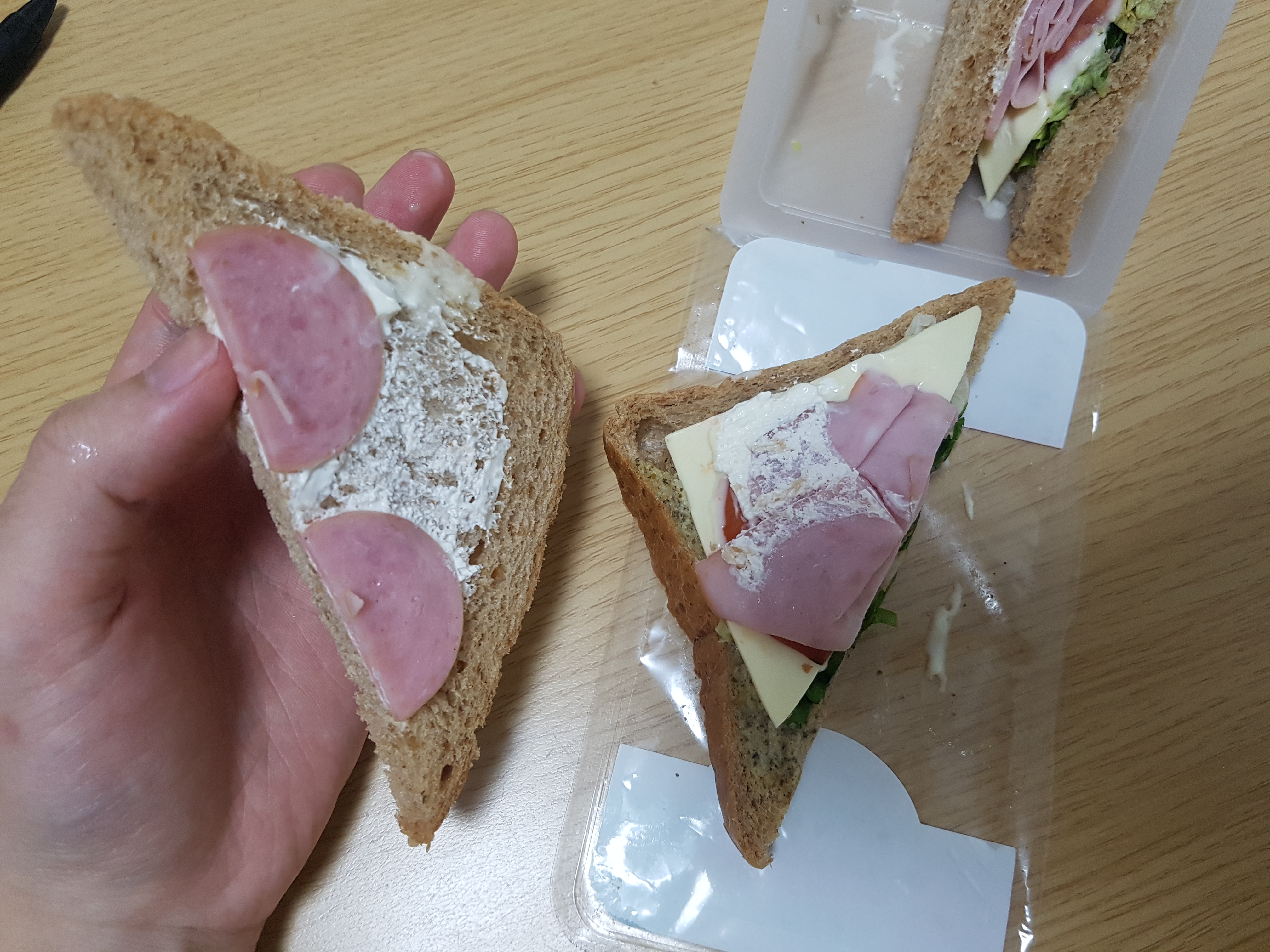 내용물은 양상추, 토마토, 치즈, 햄으로 구성되어 있어요. 샌드위치에 아삭아삭 씹히는 토마토와 양상추가 빠져서는 안되지요. ㅎㅎㅎ