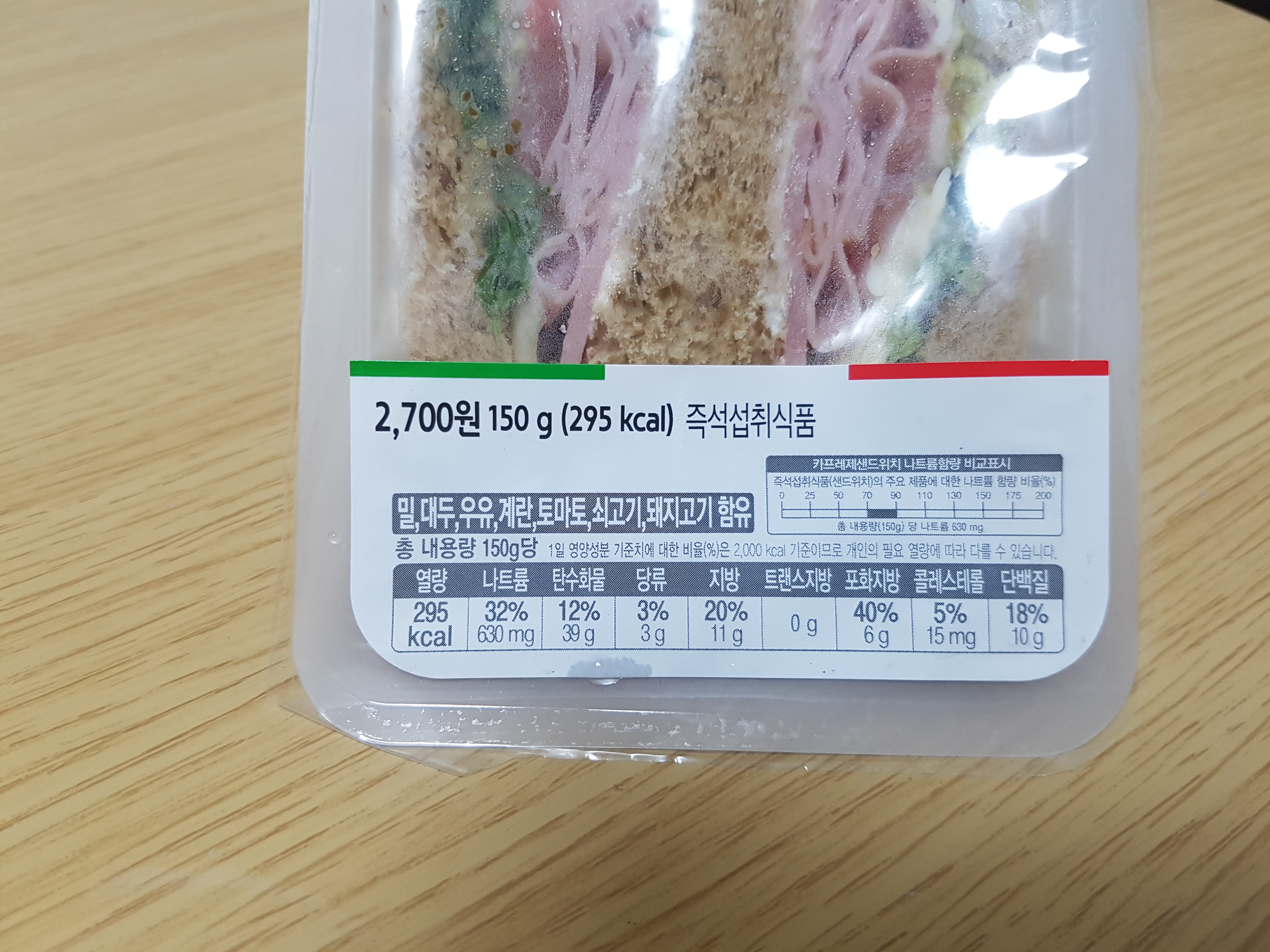 밀, 대두, 우유, 계란, 토마토, 쇠고기, 돼지고기가 함유되어 있어요. 나트륨 함량 표시 참고하시고요. 빵은 일반 밀가루가 아니라 호밀?? 그런 느낌이네요.